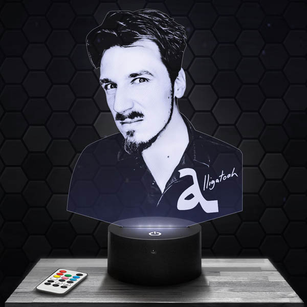 Discover the Alligatoah lamp, an essential product for all German rap enthusiasts. This 3D lamp features a high-definition engraved acrylic glass plate, laser-cut in our workshops in Clermont-Ferrand. Its black LED RGB touch base with remote control provides an immersive visual experience.