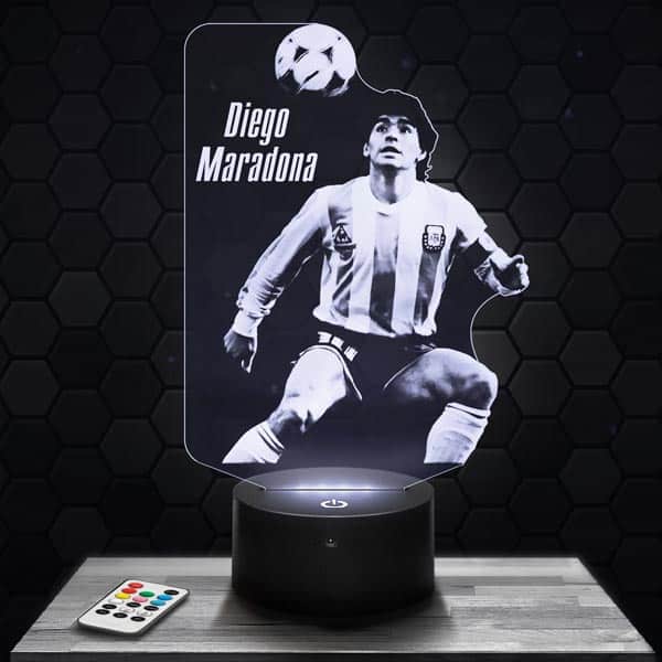 Fascinating, innovative and completely original, the Argentina – Diego Maradona 3D LED Lamp is the must-have of the moment!Our lamps consist of an engraved and laser cut plexiglass plaque and an illuminated LED base. The engraved pattern lights up when the base is switched on, giving an impressive 3D hologram effect! For the living room, bedside or desk, this lamp lends a modern touch to your home!In addition to the impressive optical illusion effect, this Argentina – Diego Maradona 3D LED lamp‘s soothing mood lighting is ideal for intimate atmospheres.Thanks to the range of illuminated bases available on Pictyourlamp.com, you can change colours whenever you like. Simply use the touch-sensitive controls on the base, or the remote control supplied with most of the bases, so you don’t even have to get up. Choose an illuminated base that features your favourite design!All our products are produced by laser engraving and cutting in our workshops located in France. We produce your orders within 24 hours (excluding weekends and holidays) and deliver to your door within 48 hours throughout Europe.In terms of electric energy consumption, all of our 3D Lamps are extremely economical. That’s because our designs consume 3 to 5 watts, which is very little for a light fixture.All our products have a 1-year guarantee. Quality is assured. If your base should be defective during this period, we will replace it as soon as possible. Nevertheless, our products are particularly reliable: the 3D lamps are designed for a minimum duration of 50,000 hours, which is equivalent to more than 5 years based on keeping the lamp on for 24 hours a day, 7 days a week, 365 days a year.Don’t wait, order your Argentina – Diego Maradona 3D LED lamp now. We will send it to you today (except weekends) and you will receive it within 48 hours.