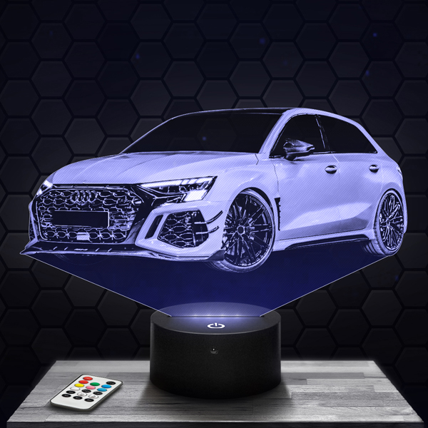 Show your passion for automobiles with this 3D Audi RS3 lamp, a luminous piece that embodies the speed and elegance of this iconic vehicle. Its finely engraved acrylic glass design highlights every curve and detail of this sports car. The touch LED base allows you to choose up to 7 colors, creating a dynamic and modern atmosphere.