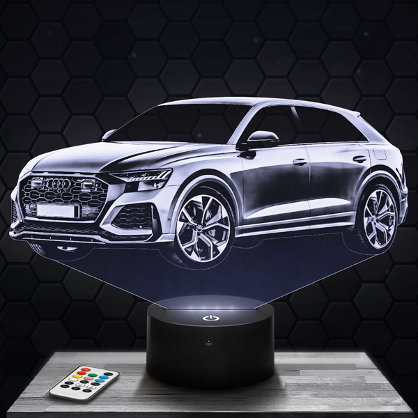 Express your passion for the Audi RSQ8 with this unique 3D lamp, a luminous piece that embodies the power and sophisticated design of this iconic vehicle. Its finely engraved acrylic glass design highlights every curve and distinctive detail of this luxury car. The touch LED base allows you to choose up to 7 colors, for a modern and refined ambiance.
