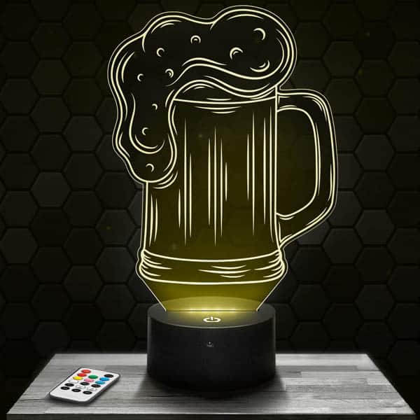 Fascinating, innovative and completely original, the Beer Mug 3D LED Lamp is the must-have of the moment!Our lamps consist of an engraved and laser cut plexiglass plaque and an illuminated LED base. The engraved pattern lights up when the base is switched on, giving an impressive 3D hologram effect! For the living room, bedside or desk, this lamp lends a modern touch to your home!In addition to the impressive optical illusion effect, this Beer Mug 3D LED lamp‘s soothing mood lighting is ideal for intimate atmospheres.Thanks to the range of illuminated bases available on Pictyourlamp.com, you can change colours whenever you like. Simply use the touch-sensitive controls on the base, or the remote control supplied with most of the bases, so you don’t even have to get up. Choose an illuminated base that features your favourite design!All our products are produced by laser engraving and cutting in our workshops located in France. We produce your orders within 24 hours (excluding weekends and holidays) and deliver to your door within 48 hours throughout Europe.In terms of electric energy consumption, all of our 3D Lamps are extremely economical. That’s because our designs consume 3 to 5 watts, which is very little for a light fixture.All our products have a 1-year guarantee. Quality is assured. If your base should be defective during this period, we will replace it as soon as possible. Nevertheless, our products are particularly reliable: the 3D lamps are designed for a minimum duration of 50,000 hours, which is equivalent to more than 5 years based on keeping the lamp on for 24 hours a day, 7 days a week, 365 days a year.Don’t wait, order your Beer Mug 3D LED lamp now. We will send it to you today (except weekends) and you will receive it within 48 hours.