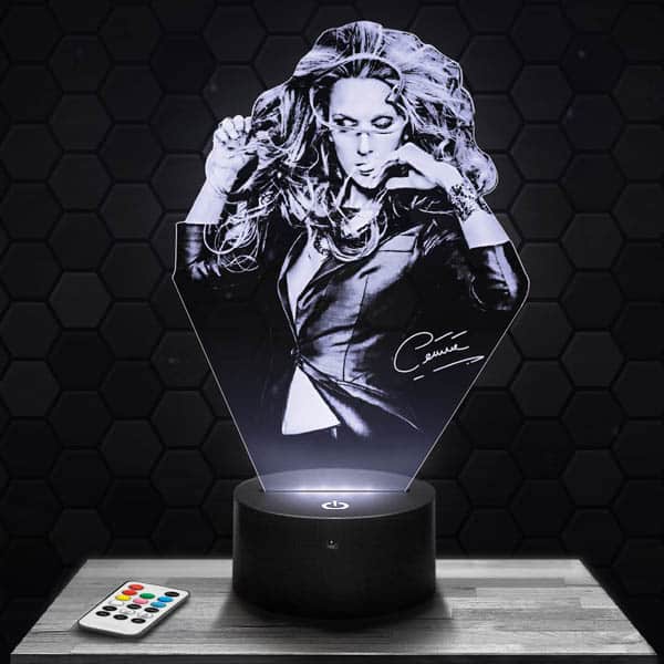 Fascinating, innovative and completely original, the Celine Dion 3D LED Lamp is the must-have of the moment!Our lamps consist of an engraved and laser cut plexiglass plaque and an illuminated LED base. The engraved pattern lights up when the base is switched on, giving an impressive 3D hologram effect! For the living room, bedside or desk, this lamp lends a modern touch to your home!In addition to the impressive optical illusion effect, this Celine Dion 3D LED lamp‘s soothing mood lighting is ideal for intimate atmospheres.Thanks to the range of illuminated bases available on Pictyourlamp.com, you can change colours whenever you like. Simply use the touch-sensitive controls on the base, or the remote control supplied with most of the bases, so you don’t even have to get up. Choose an illuminated base that features your favourite design!All our products are produced by laser engraving and cutting in our workshops located in France. We produce your orders within 24 hours (excluding weekends and holidays) and deliver to your door within 48 hours throughout Europe.In terms of electric energy consumption, all of our 3D Lamps are extremely economical. That’s because our designs consume 3 to 5 watts, which is very little for a light fixture.All our products have a 1-year guarantee. Quality is assured. If your base should be defective during this period, we will replace it as soon as possible. Nevertheless, our products are particularly reliable: the 3D lamps are designed for a minimum duration of 50,000 hours, which is equivalent to more than 5 years based on keeping the lamp on for 24 hours a day, 7 days a week, 365 days a year.Don’t wait, order your Celine Dion 3D LED lamp now. We will send it to you today (except weekends) and you will receive it within 48 hours.