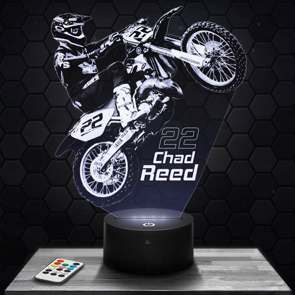 Discover the Chad Reed Honda Motocross lamp, a true gem for motocross and extreme sports enthusiasts. With its unique 3D design, this lamp will bring a touch of originality to your interior. Carefully crafted in our workshops in Clermont-Ferrand, the engraved high-definition acrylic glass plate, laser-cut, offers exceptional visual rendering.