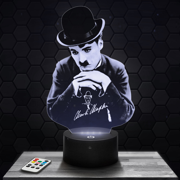 Express your admiration for Charlie Chaplin with this original 3D lamp, a luminous piece that captures all the elegance and charisma of this legendary artist. Its finely engraved acrylic glass design highlights every detail of his famous bowler hat and cane. The touch LED base allows you to choose up to 7 colors, for a soft and nostalgic ambiance.