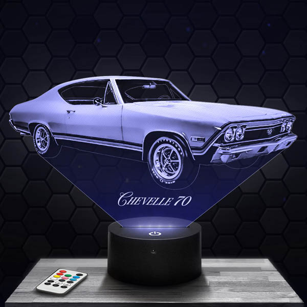 Discover the Chevrolet Chevelle SS 396 3D lamp, a true masterpiece for vintage car enthusiasts. With its high-definition engraved acrylic glass plate, laser-cut in our workshops in Clermont-Ferrand, this lamp offers exceptional visual rendering. Its touch-sensitive RGB LED black base with remote control allows you to choose from 7 different colors, creating a fascinating hologram effect. Whether in the living room, bedroom, or as a desk lamp, this lamp will add a unique touch to your decor.