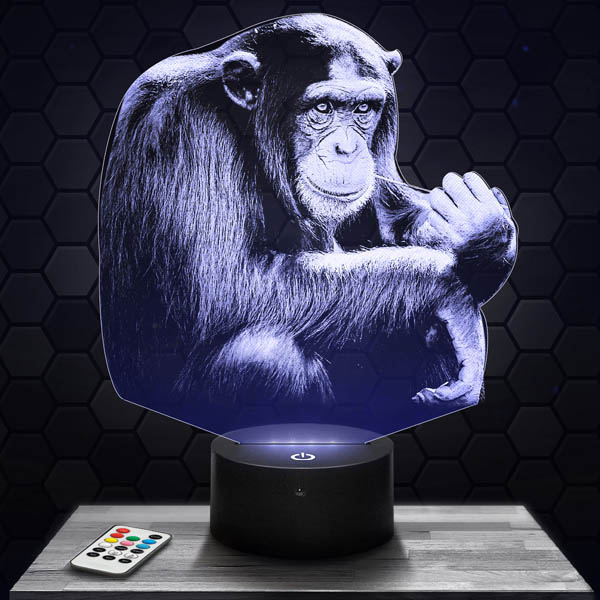 Discover our Chimpanzee 3D lamp, a true work of art that will bring a touch of magic to your interior. Thanks to its high-definition engraved acrylic glass plate, laser-cut in our workshops in Clermont-Ferrand, this lamp offers exceptional visual rendering. Its Black RGB LED touch base with remote control allows you to choose from 7 different colors, creating a fascinating hologram effect. Whether in the living room, bedroom, or as a desk lamp, the Chimpanzee lamp will bring a warm and unique atmosphere.