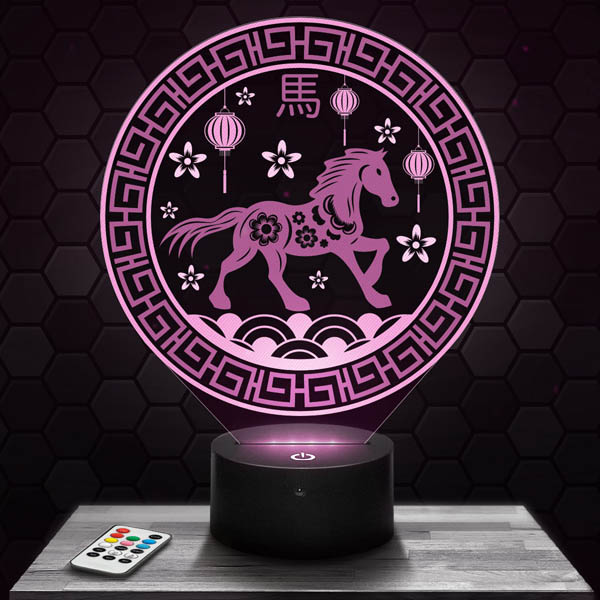 Discover our “Chinese Zodiac Sign Horse” 3D lamp that will delight all Chinese astrology enthusiasts. Thanks to its high-definition engraved acrylic glass plate, laser-cut in our workshops in Clermont-Ferrand, this lamp offers exceptional visual quality. Its Black RGB LED touch base with remote control allows you to choose from 7 different colors, creating a fascinating hologram effect. Whether in the living room, bedroom, or as a desk lamp, this lamp will bring a unique and captivating atmosphere.