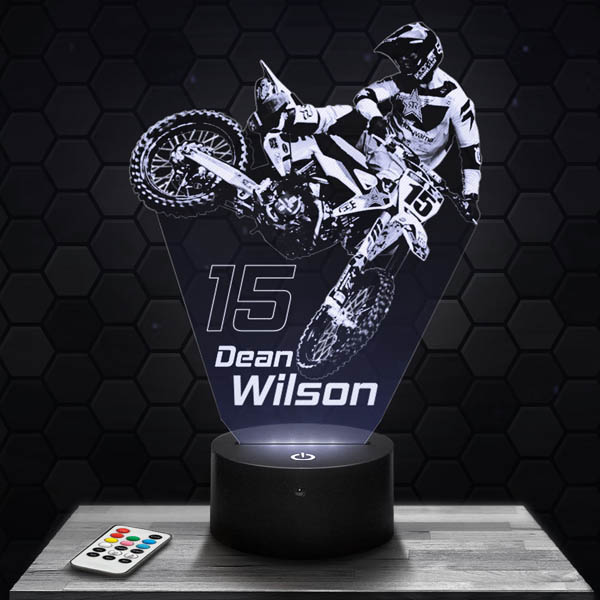 Discover the Dean Wilson Honda Motocross lamp, an essential product for all motocross enthusiasts. With its touch-sensitive RGB LED black base and its high-definition engraved acrylic glass plate, this lamp offers a fascinating hologram effect that will illuminate your living room, bedroom, or office.