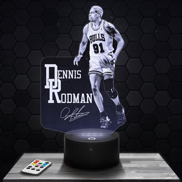 Light up your space with our 3D lamp featuring Dennis Rodman, the legendary NBA defender and rebounder famous for his time with the Chicago Bulls. The precision-engraved acrylic glass plate captures the details of the player with his unique style and striking personality. Its touch-sensitive RGB LED base allows you to choose from 7 vibrant colors, creating a dynamic and energetic ambiance. Ideal for the living room, bedroom, or office, this lamp will become the focal point of your decor.