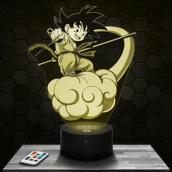Discover our 3D lamp featuring Goku child on his Nimbus from Dragon Ball, a must-have for fans of this legendary manga. With a precisely engraved acrylic glass plate, this lamp offers exceptional visual quality. Its RGB LED touch Black base with remote control allows you to choose from 7 vibrant colors, creating an immersive and unique ambiance. Ideal for the living room, bedroom, or office, this lamp will become the focal point of your decor.