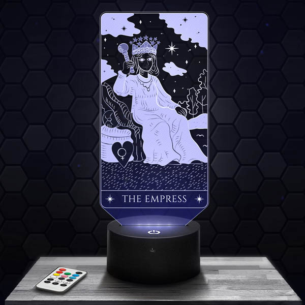 Discover the Empress Tarot Arcana lamp, a 3D lamp that will delight lovers of clairvoyance, cartomancy and esotericism. Thanks to its acrylic glass plate engraved in high definition and laser cut in our workshops in Clermont-Ferrand, this lamp offers an exceptional visual. Its black LED RVB Tactile LED light with remote control allows you to choose from 7 different colors, thus creating a fascinating hologram effect. Whether in the living room, the bedroom or as a desk lamp, the Impector Arcane Tarot will bring a mystical and bewitching atmosphere. It is also an ideal gift for a birthday or for Christmas.