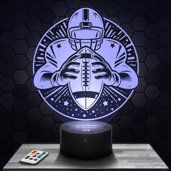Express your love for American football with this original 3D lamp, a luminous piece that captures all the energy and dynamics of this iconic sport. Its finely engraved acrylic glass design highlights every detail of the ball and equipment, creating a sporty and inspiring atmosphere. The touch LED base allows you to choose up to 7 colors, for a vibrant and personalized ambiance.