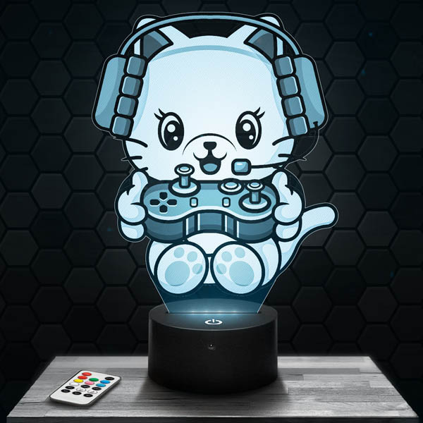 Discover our “Gamer Cat” 3D lamp that will delight all video game enthusiasts. With its RGB LED touch-sensitive black base and remote control, this lamp offers a unique visual experience. The high-definition engraved acrylic glass plate, laser-cut in our workshops in Clermont-Ferrand, creates a fascinating hologram effect. Whether in the living room, bedroom, or as a desk lamp, this lamp will bring a touch of modernity to your gaming space.