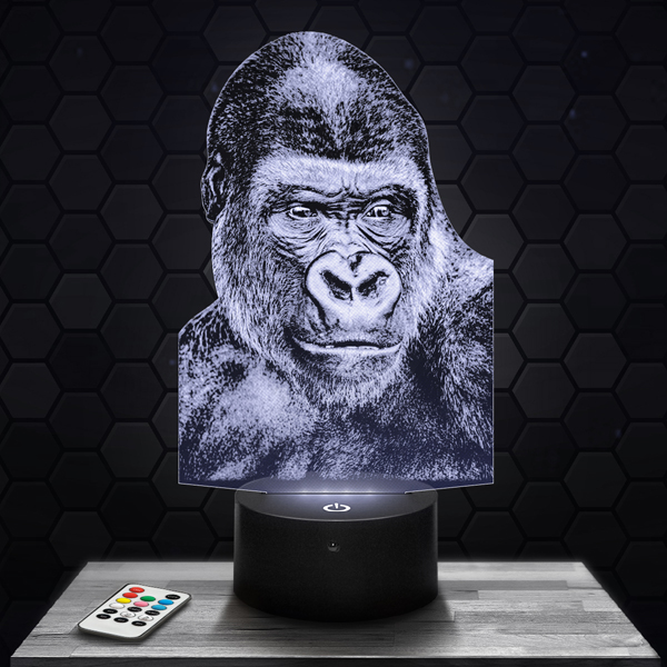 Express your admiration for the gorilla with this unique 3D lamp, a luminous piece that captures all the power and nobility of this iconic animal. Its finely engraved acrylic glass design highlights every detail of the face and the imposing expression of this great primate. The touch LED base allows you to choose up to 7 colors, for a captivating and soothing ambiance.