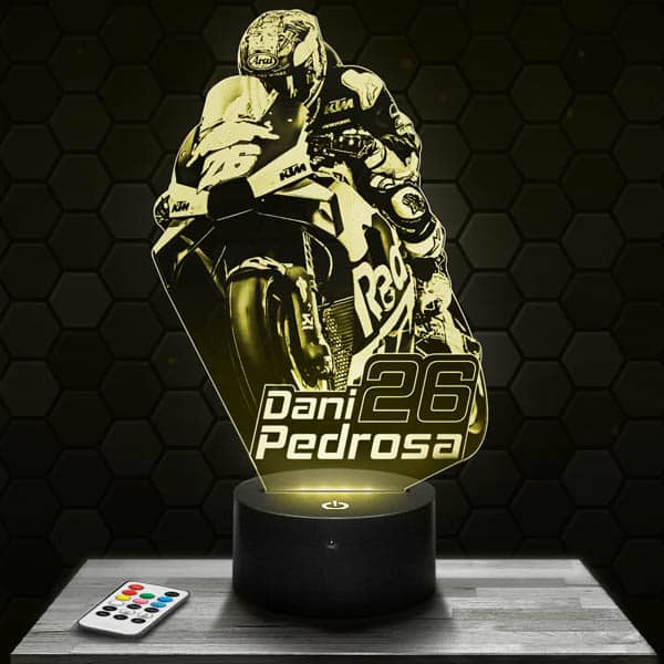 Fascinating, innovative and completely original, the GP Moto KTM Dani Pedrosa 3D LED Lamp is the must-have of the moment!Our lamps consist of an engraved and laser cut plexiglass plaque and an illuminated LED base. The engraved pattern lights up when the base is switched on, giving an impressive 3D hologram effect! For the living room, bedside or desk, this lamp lends a modern touch to your home!In addition to the impressive optical illusion effect, this GP Moto KTM Dani Pedrosa 3D LED lamp‘s soothing mood lighting is ideal for intimate atmospheres.Thanks to the range of illuminated bases available on Pictyourlamp.com, you can change colours whenever you like. Simply use the touch-sensitive controls on the base, or the remote control supplied with most of the bases, so you don’t even have to get up. Choose an illuminated base that features your favourite design!All our products are produced by laser engraving and cutting in our workshops located in France. We produce your orders within 24 hours (excluding weekends and holidays) and deliver to your door within 48 hours throughout Europe.In terms of electric energy consumption, all of our 3D Lamps are extremely economical. That’s because our designs consume 3 to 5 watts, which is very little for a light fixture.All our products have a 1-year guarantee. Quality is assured. If your base should be defective during this period, we will replace it as soon as possible. Nevertheless, our products are particularly reliable: the 3D lamps are designed for a minimum duration of 50,000 hours, which is equivalent to more than 5 years based on keeping the lamp on for 24 hours a day, 7 days a week, 365 days a year.Don’t wait, order your GP Moto KTM Dani Pedrosa 3D LED lamp now. We will send it to you today (except weekends) and you will receive it within 48 hours.