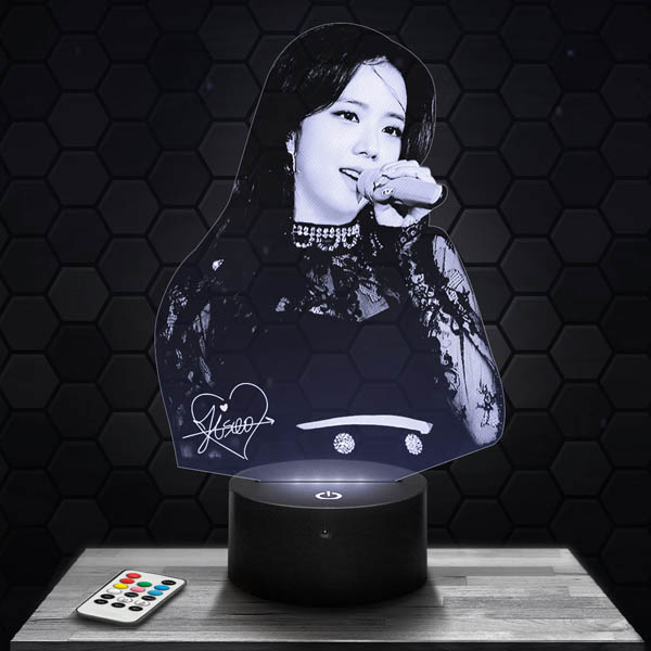 Discover the Jisoo Blackpink lamp, an essential product for all K-pop fans. This 3D lamp features a high-definition engraved acrylic glass plate, laser-cut in our workshops in Clermont-Ferrand. Its Black RGB LED touch base with remote control offers a captivating visual experience. When you turn on the lamp, the visual illuminates, creating a fascinating hologram effect.