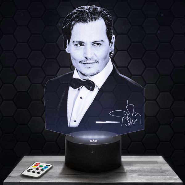 Discover our Johnny Depp lamp, an essential product for all fans of this iconic actor. Thanks to its high-definition engraved acrylic glass plate, laser-cut in our workshops in Clermont-Ferrand, this lamp offers a fascinating hologram effect that will illuminate your living room, bedroom, or office. With its black LED RGB touch base and included remote control, you can choose from 7 different colors to create the perfect ambiance.