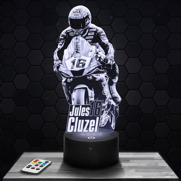 The Jules Cluzel 3D lamp is the perfect gift for any motorcycle racing and competition enthusiast. Whether for a birthday or Christmas, this lamp will delight fans of Jules Cluzel. The included remote control makes it easy to customize the colors, adding an energetic touch to your decor. This one-of-a-kind lamp is perfect for creating an atmosphere worthy of MotoGP races.