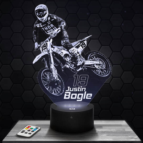 Discover the Justin Bogle Suzuki Motocross lamp, an essential product for all motocross and extreme sports fans. With its unique 3D design, this lamp will bring a touch of originality to your interior. Carefully crafted in our workshops in Clermont-Ferrand, the engraved high-definition acrylic glass plate, laser-cut, offers exceptional quality.