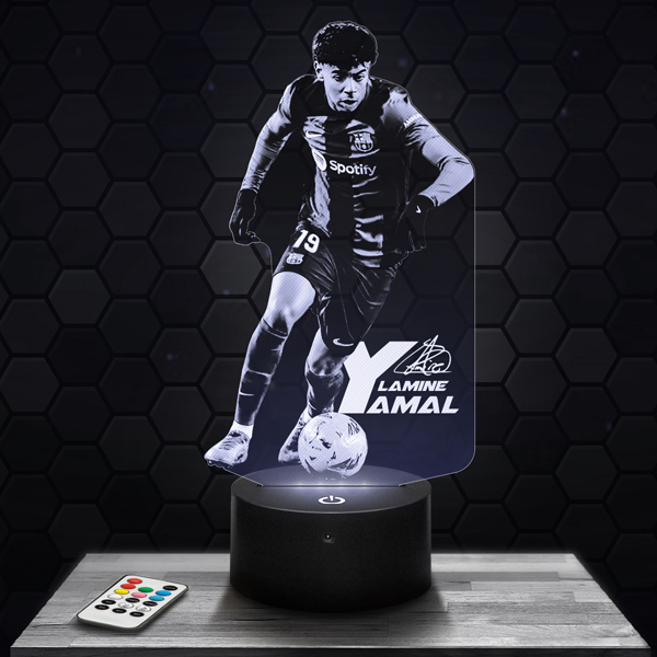 Energy-efficient, this Lamine Yamal lamp operates on batteries or via USB. Carefully designed and precisely engraved, it adds a touch of style to your decor while symbolizing the talent and determination of Lamine Yamal.