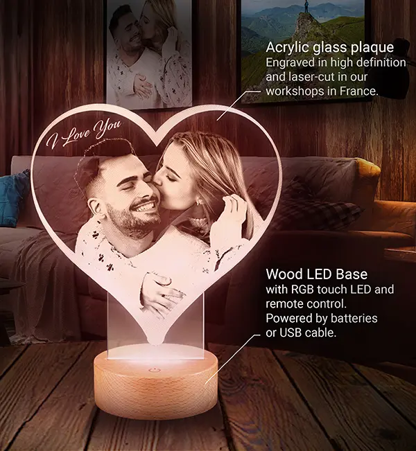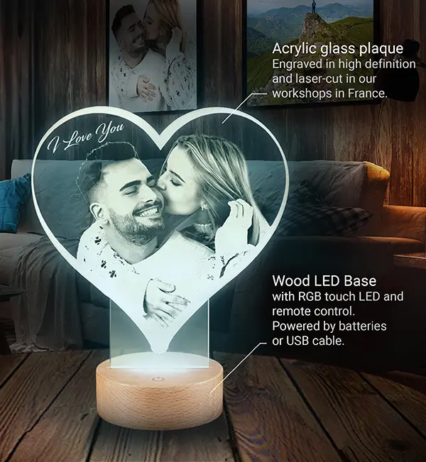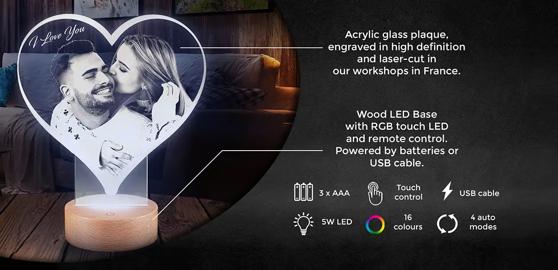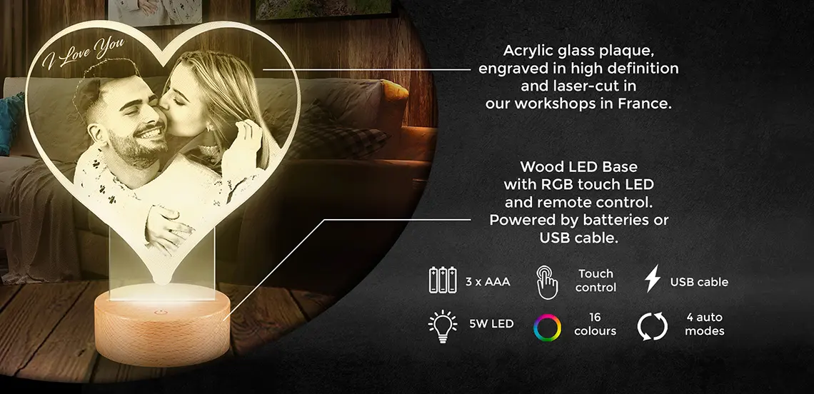 Composed of an illuminated LED base and an engraved and laser-cut plexiglass plaque that inserts into the base, the 3D LED lamp is a fascinating decorative object. When the base is switched on, the engraved pattern lights up to give an impressive hologram effect!