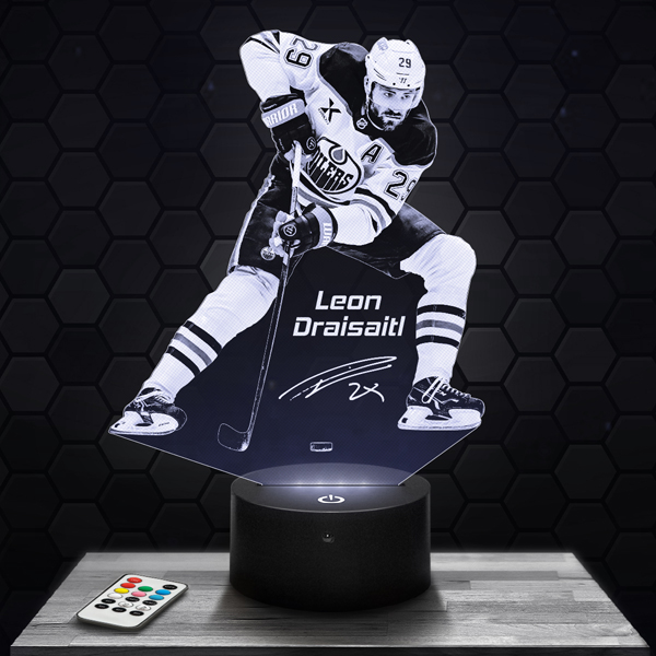 Show your passion for hockey with this unique 3D lamp featuring Leon Draisaitl, a luminous piece that embodies the power and elegance of this exceptional player. Its finely engraved acrylic glass design highlights every detail of his equipment and determined expression. The touch LED base offers up to 7 colors, creating a dynamic and inspiring atmosphere.
