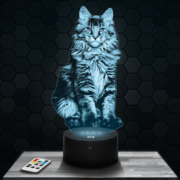 Express your love for the Maine Coon with this unique 3D lamp, a luminous piece that captures all the grace and majesty of this iconic cat. Its finely engraved acrylic glass design highlights every detail of its fur and captivating gaze. The touch LED base allows you to choose up to 7 colors, for a soft and soothing ambiance.