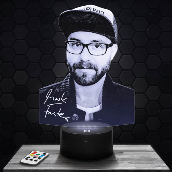 Discover our Mark Forster 3D lamp, an essential product for all fans of this famous German singer. With its high-definition engraved acrylic glass plate, laser-cut in our workshops in Clermont-Ferrand, this lamp offers exceptional visual quality. Its black LED RGB touch base with remote control allows you to choose from 7 different colors, creating a fascinating hologram effect. Whether in the living room, bedroom, or as a desk lamp, this lamp is ideal for creating a unique atmosphere and adding a touch of style to your interior.