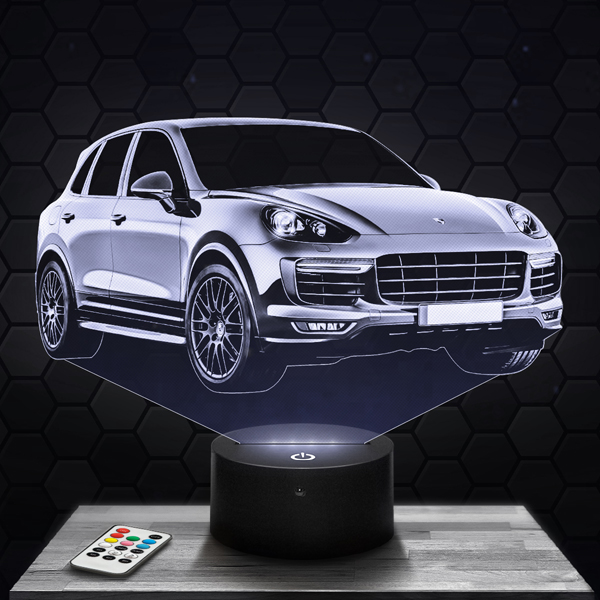 Express your passion for the Porsche Cayenne with this unique 3D lamp, a luminous piece that embodies the elegance and power of this iconic vehicle. Its finely engraved acrylic glass design highlights every curve and distinctive detail of the Cayenne. The touch LED base allows you to choose up to 7 colors, creating a sophisticated and modern ambiance.