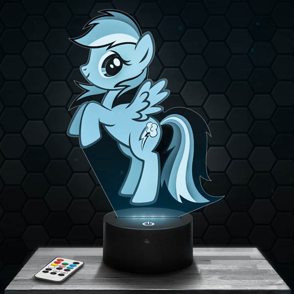 Discover the 3D Rainbow Dash My Little Pony lamp, a must-have product for all fans of the famous unicorn pony. This lamp features a high-definition engraved acrylic glass plate, laser-cut in our workshops in Clermont-Ferrand, offering exceptional visual quality. Its touch-sensitive RGB LED black base with a remote control allows you to choose from 7 different colors, creating a captivating hologram effect. Whether in the living room, bedroom, or as a desk lamp, the Rainbow Dash My Little Pony lamp will add a magical touch to your interior.