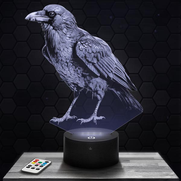 Delve into the depths of mystery with our 3D lamp featuring a crow. Finely engraved on an acrylic plate, this artistic representation captures the enigmatic aura and wisdom often associated with this iconic bird. Illuminated by an RGB LED base offering seven different colors, this lamp brings an intriguing and captivating ambiance to your space.