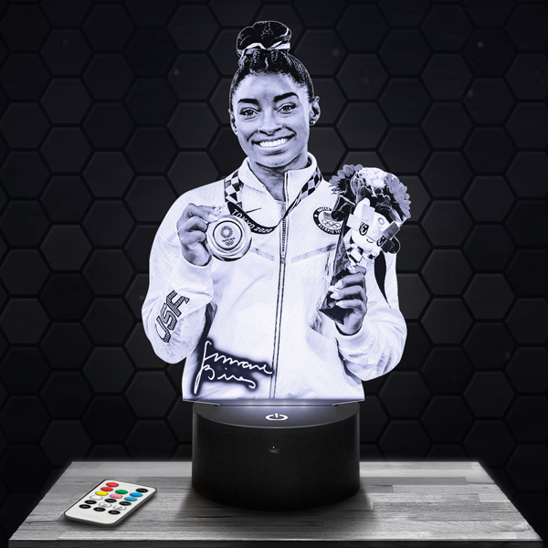 Express your admiration for Simone Biles with this unique 3D lamp, a luminous piece that captures all the grace and strength of this iconic athlete. Its finely engraved acrylic glass design highlights every movement and expression of this legendary gymnast. The touch LED base allows you to choose up to 7 colors, for an inspiring and dynamic atmosphere.