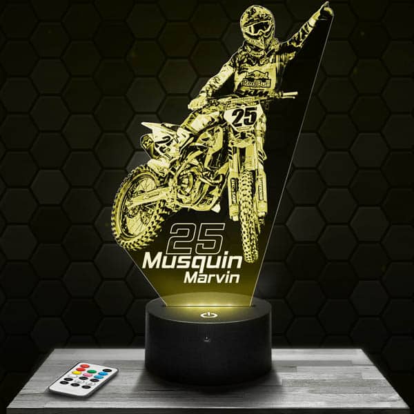 Fascinating, innovative and completely original, the Supercross Red Bull KTM Marvin Musquin 3D LED Lamp is the must-have of the moment!Our lamps consist of an engraved and laser cut plexiglass plaque and an illuminated LED base. The engraved pattern lights up when the base is switched on, giving an impressive 3D hologram effect! For the living room, bedside or desk, this lamp lends a modern touch to your home!In addition to the impressive optical illusion effect, this Supercross Red Bull KTM Marvin Musquin 3D LED lamp‘s soothing mood lighting is ideal for intimate atmospheres.Thanks to the range of illuminated bases available on Pictyourlamp.com, you can change colours whenever you like. Simply use the touch-sensitive controls on the base, or the remote control supplied with most of the bases, so you don’t even have to get up. Choose an illuminated base that features your favourite design!All our products are produced by laser engraving and cutting in our workshops located in France. We produce your orders within 24 hours (excluding weekends and holidays) and deliver to your door within 48 hours throughout Europe.In terms of electric energy consumption, all of our 3D Lamps are extremely economical. That’s because our designs consume 3 to 5 watts, which is very little for a light fixture.All our products have a 1-year guarantee. Quality is assured. If your base should be defective during this period, we will replace it as soon as possible. Nevertheless, our products are particularly reliable: the 3D lamps are designed for a minimum duration of 50,000 hours, which is equivalent to more than 5 years based on keeping the lamp on for 24 hours a day, 7 days a week, 365 days a year.Don’t wait, order your Supercross Red Bull KTM Marvin Musquin 3D LED lamp now. We will send it to you today (except weekends) and you will receive it within 48 hours.