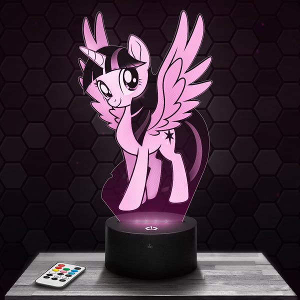 Discover the Twilight Sparkle My Little Pony 3D lamp, an essential product for all fans of the famous unicorn. With its high-definition engraved acrylic glass plate, laser-cut in our workshops in Clermont-Ferrand, this lamp offers exceptionally high-quality visuals. Its touch-sensitive RGB LED black base with a remote control allows you to choose from 7 different colors, creating a fascinating hologram effect. Whether in the living room, bedroom, or as a desk lamp, this lamp will add a magical touch to your interior. Ideal as a birthday or Christmas gift, it is also a perfect choice for all My Little Pony fans.