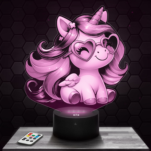 Bring a fairy-tale ambiance to your interior with this 3D Unicorn Glasses Lamp, a luminous creation that embodies fantasy and elegance. Its finely engraved acrylic glass design highlights every enchanting detail of the unicorn, from the stylish glasses to the majestic mane. The touch LED base offers a choice of 7 colors, creating a soft and magical atmosphere.