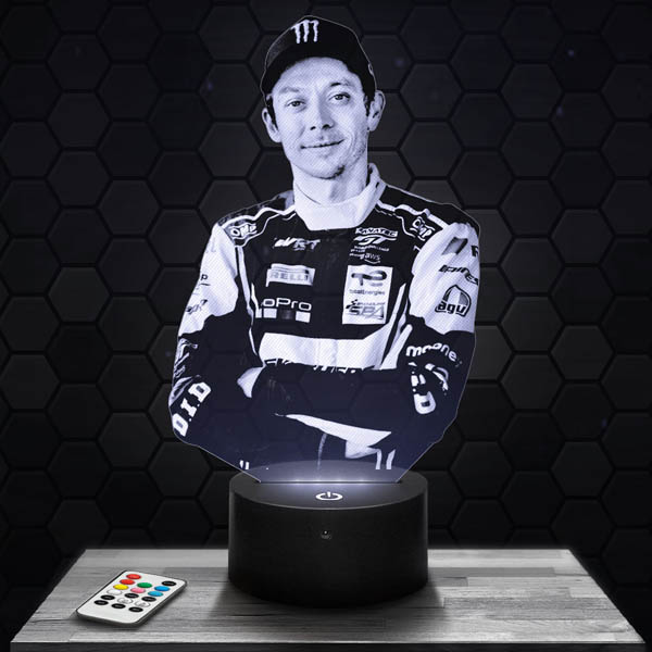 Discover the Valentino Rossi Moto GP Pilot 3D lamp, an essential product for all sports and motorcycle fans. With its high-definition engraved acrylic glass plate, laser-cut in our workshops in Clermont-Ferrand, this lamp offers exceptional visual quality. Its Black RGB LED touch base with remote control allows you to choose from 7 different colors, creating a fascinating hologram effect. Whether in the living room, bedroom, or as a desk lamp, this lamp will bring a unique ambiance to your space.