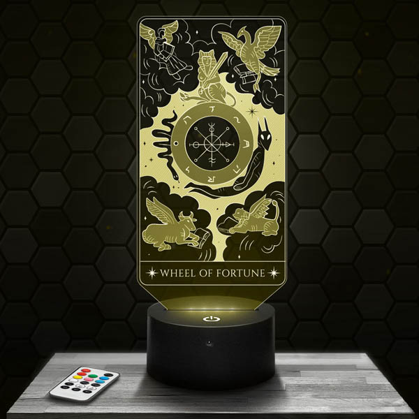 Discover the Wheel of Fortune Tarot Arcana, a 3D lamp that will immerse you in the mysterious universe of clairvoyance and cartomancy. Thanks to its acrylic glass plate engraved in high definition and laser cut in our workshops in Clermont-Ferrand, this lamp offers an exceptional quality.