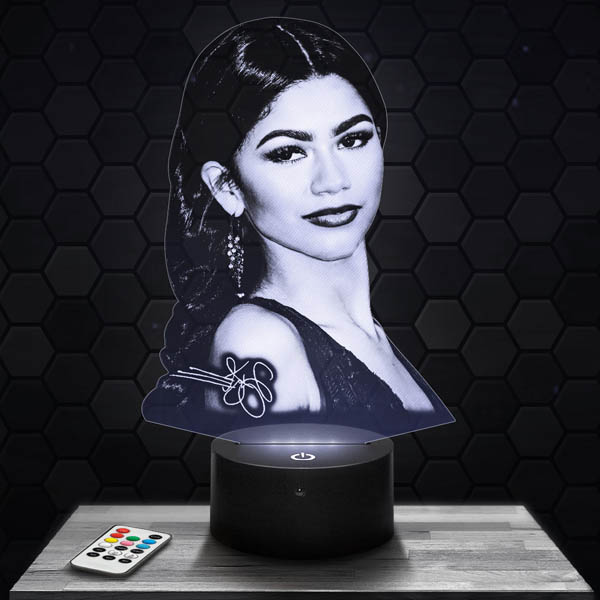 Discover our Zendaya 3D lamp, an essential product for all fans of this talented actress. With its high-definition engraved acrylic glass plate, laser-cut in our workshops in Clermont-Ferrand, this lamp offers exceptional visual quality. Its Black RGB LED touch base with remote control allows you to choose from 7 different colors, creating a fascinating hologram effect. Whether for the living room, bedroom, or as a desk lamp, the Zendaya 3D lamp will bring a touch of style and originality to your interior.